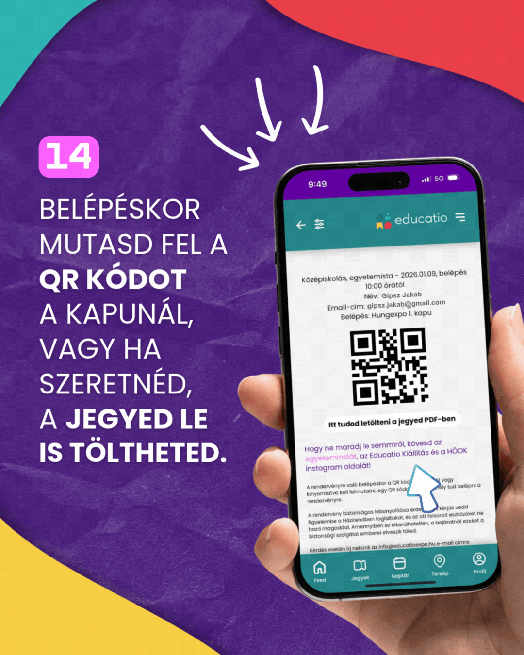 Ez a QR kód lesz a kulcsod az Educatio világába, nélküle nem tudsz részt venni a programokon, előadásokon és standlátogatásokon. Éppen ezért ne hagyd az utolsó pillanatra! Érdemes már most előre elvégezni a regisztrációt, így a helyszínen gyorsabban bejuthatsz, és rögtön belevetheted magad a lehetőségek tengerébe.
